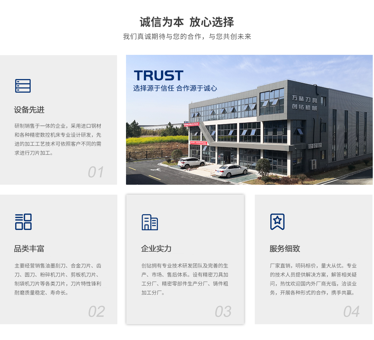 馬鞍山創(chuàng)鉆機(jī)械科技有限公司 INTRODUCTION 馬鞍山市創(chuàng)鉆機(jī)械科技有限公司(創(chuàng)鉆機(jī)械)坐落于鋼鐵之城-安徽馬鞍山,公司擁有專業(yè)的技術(shù)研發(fā)團(tuán)隊(duì)及完善的生產(chǎn)、市場、售后體系。公司設(shè)有精密刀具加工分廠、精密零部件生產(chǎn)分廠、鑄件粗加工分廠,...